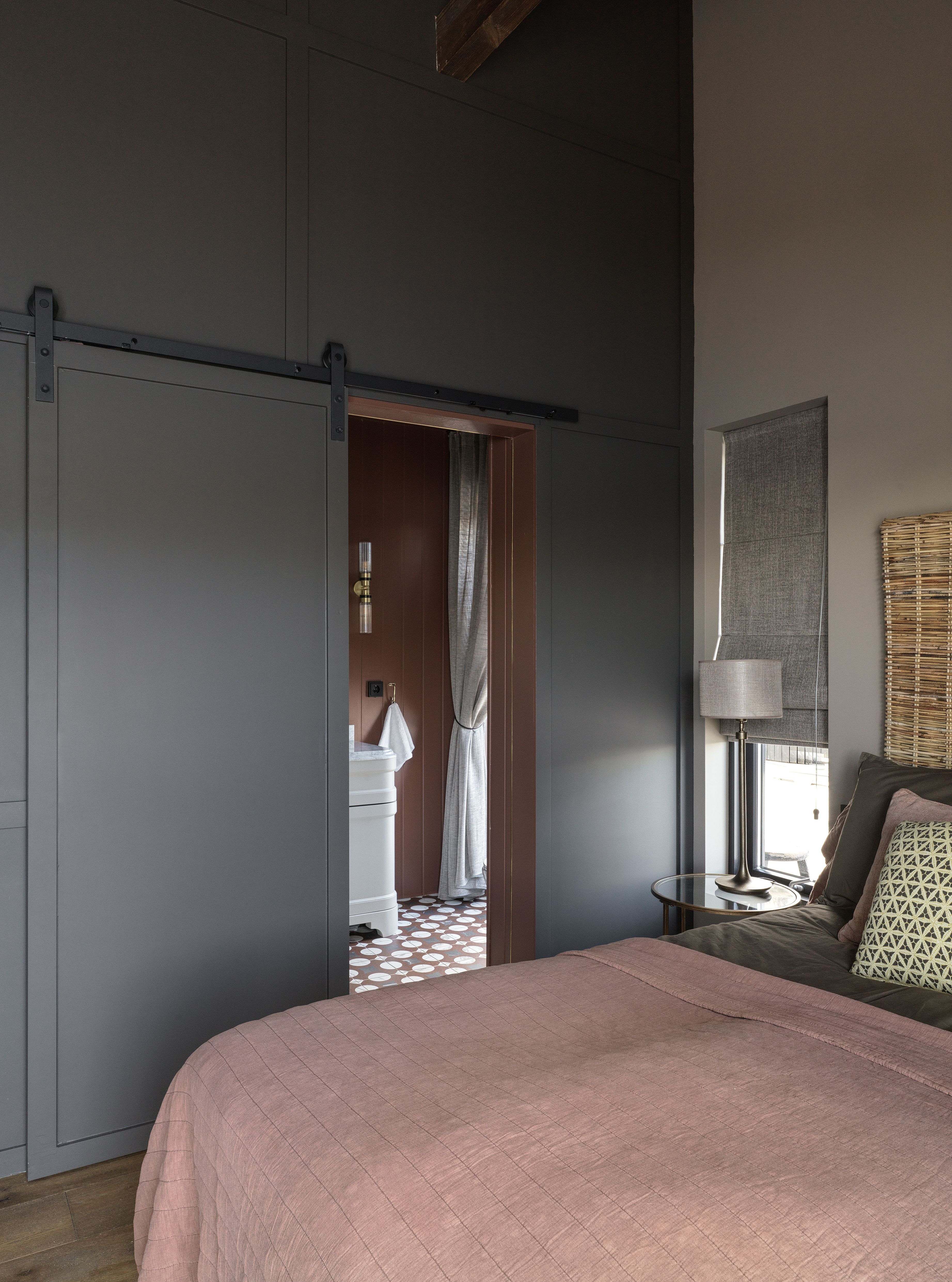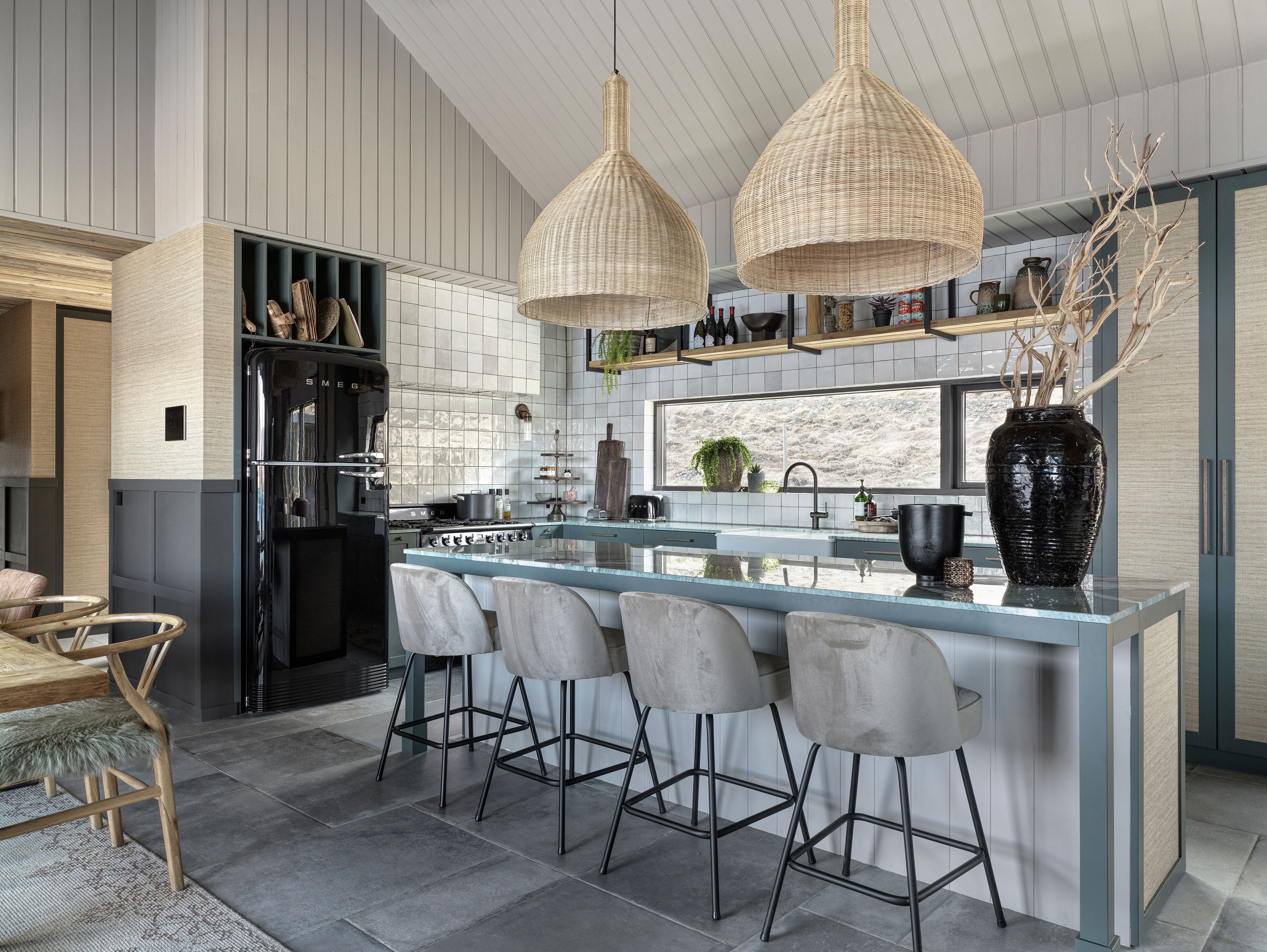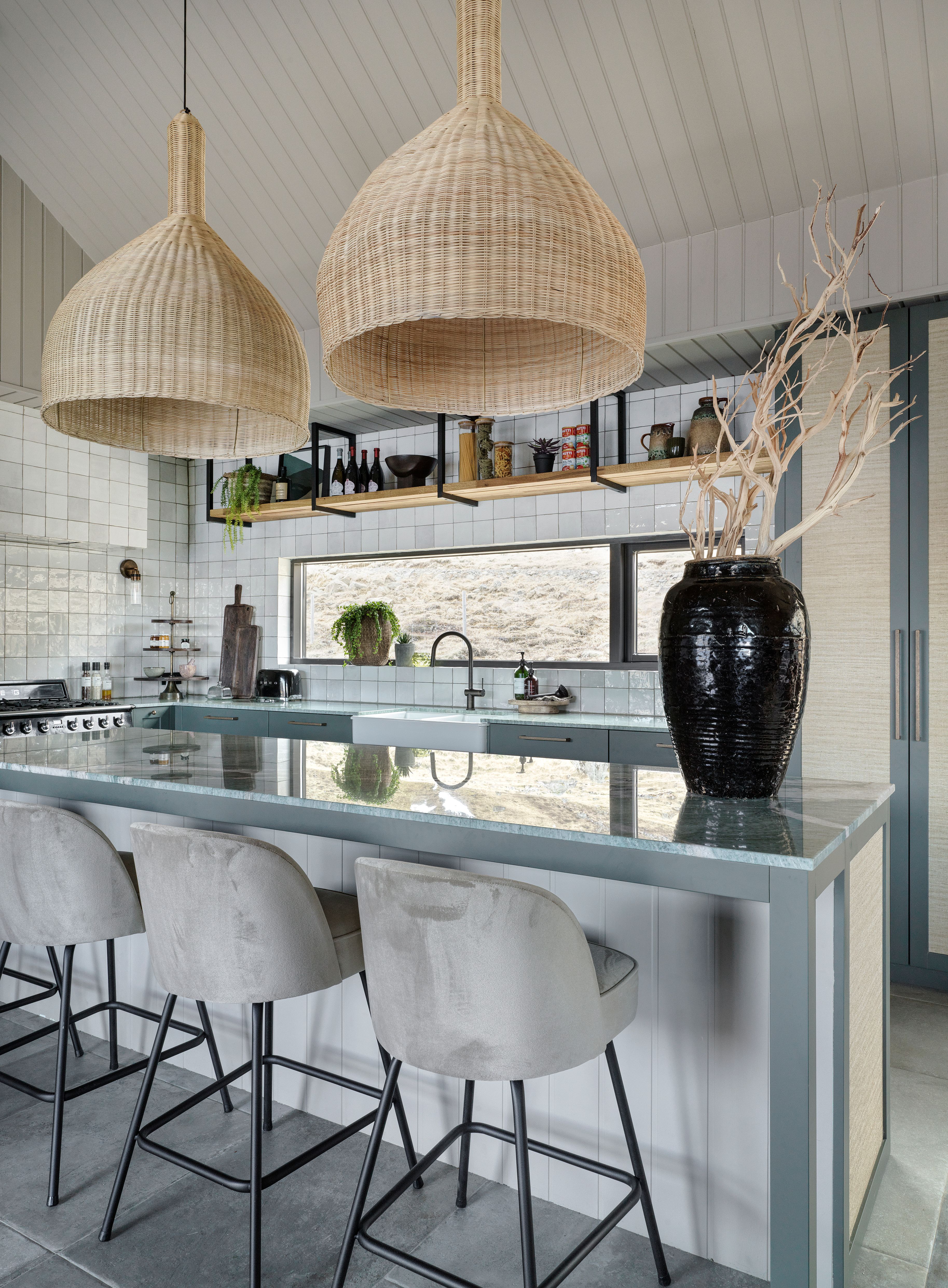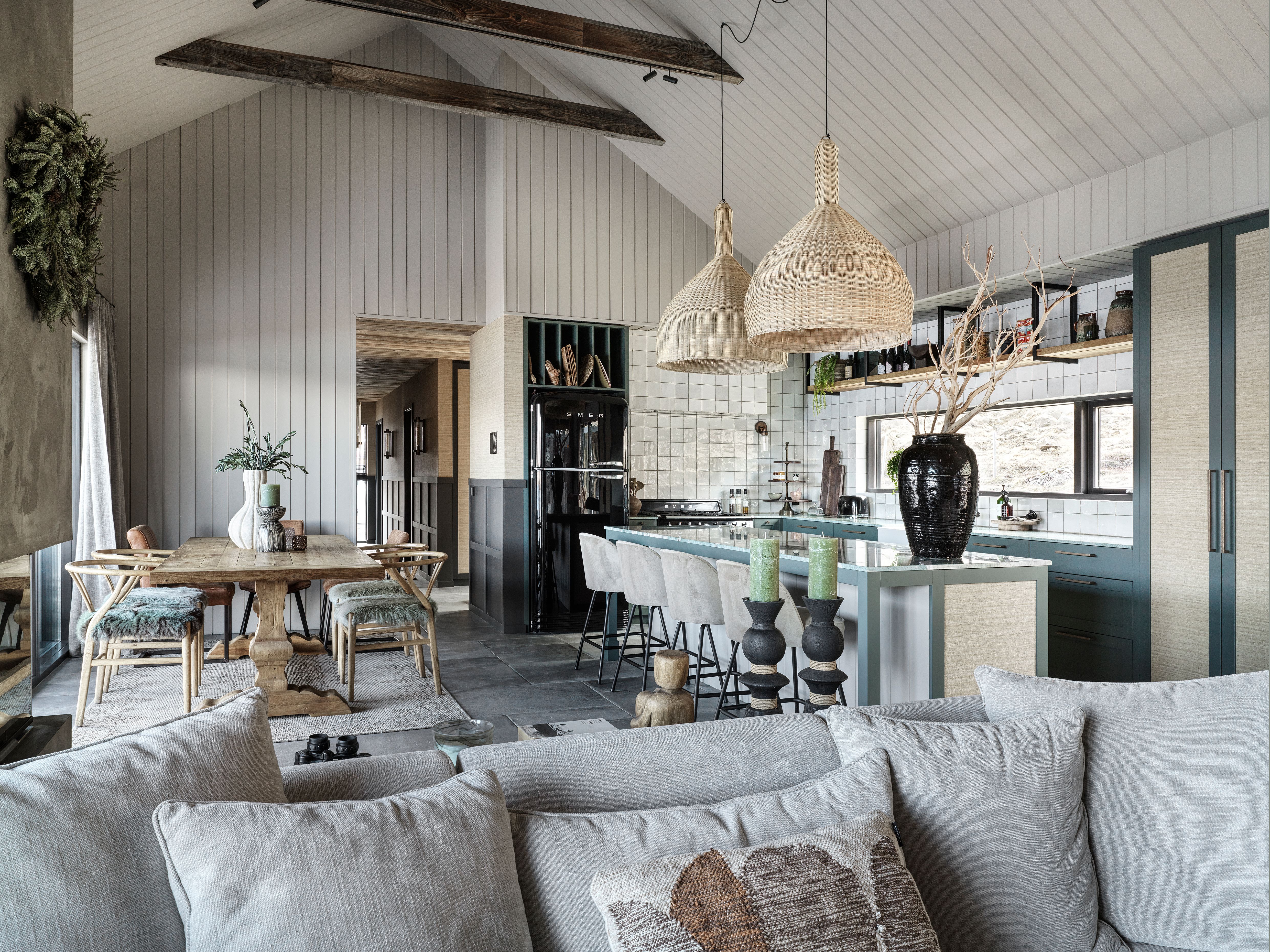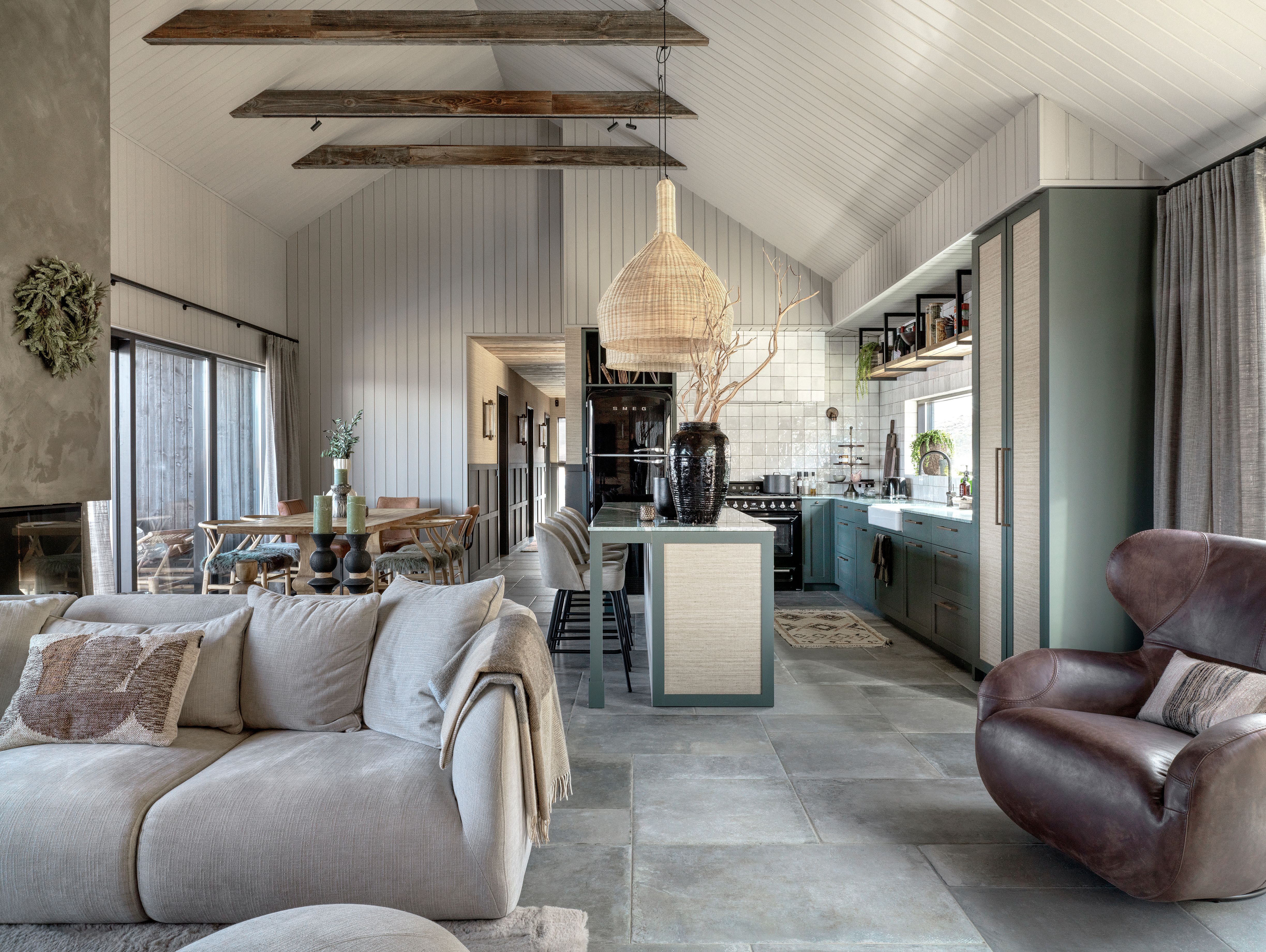 Natural materials were chosen throughout the space to create warmth and longevity. Timber surfaces, stone flooring, woven textures, and soft neutral fabrics establish a tactile palette that feels both refined and relaxed. The exposed roof structure and high ceiling emphasize the architecture of the house while maintaining a sense of openness.