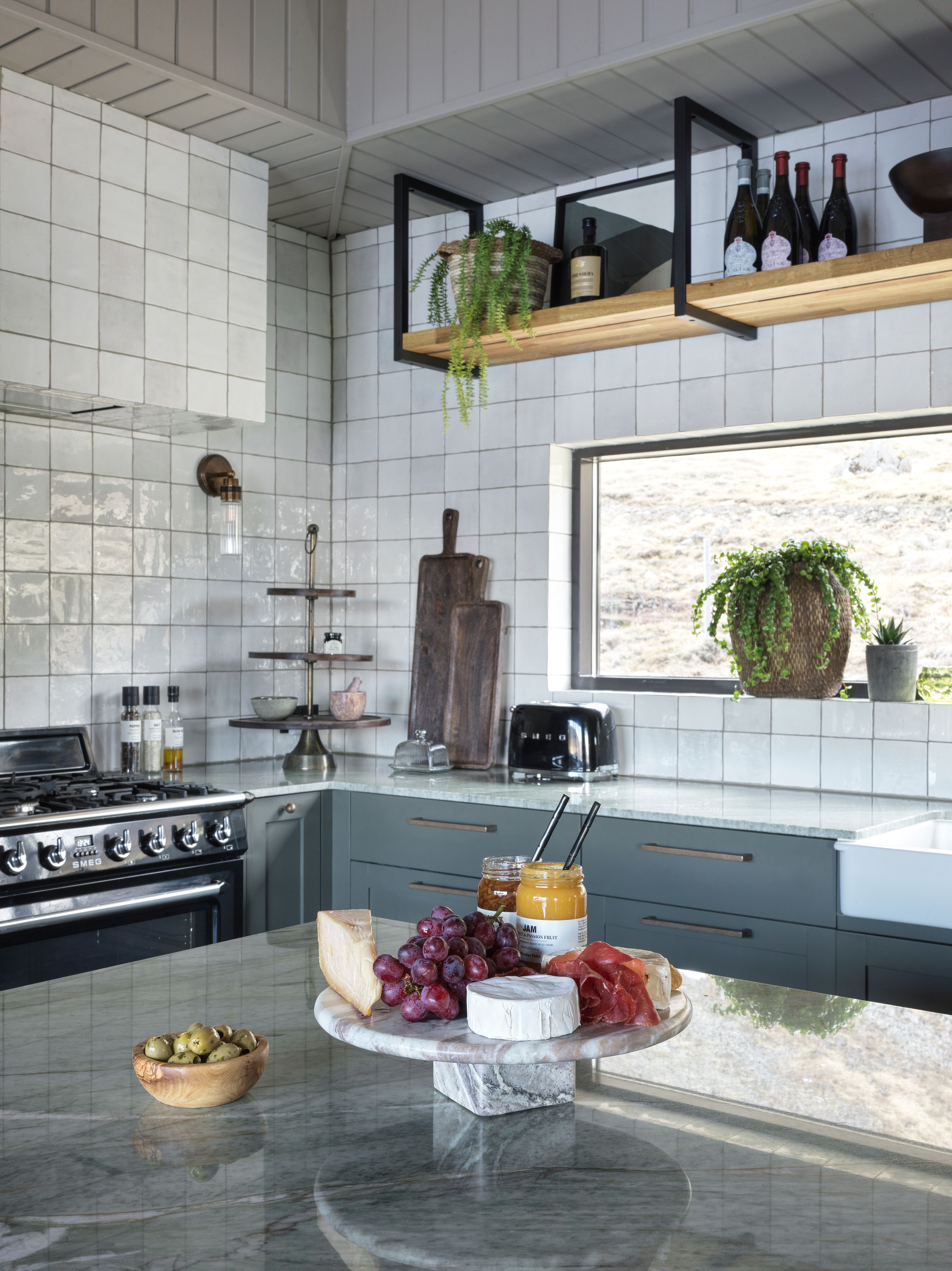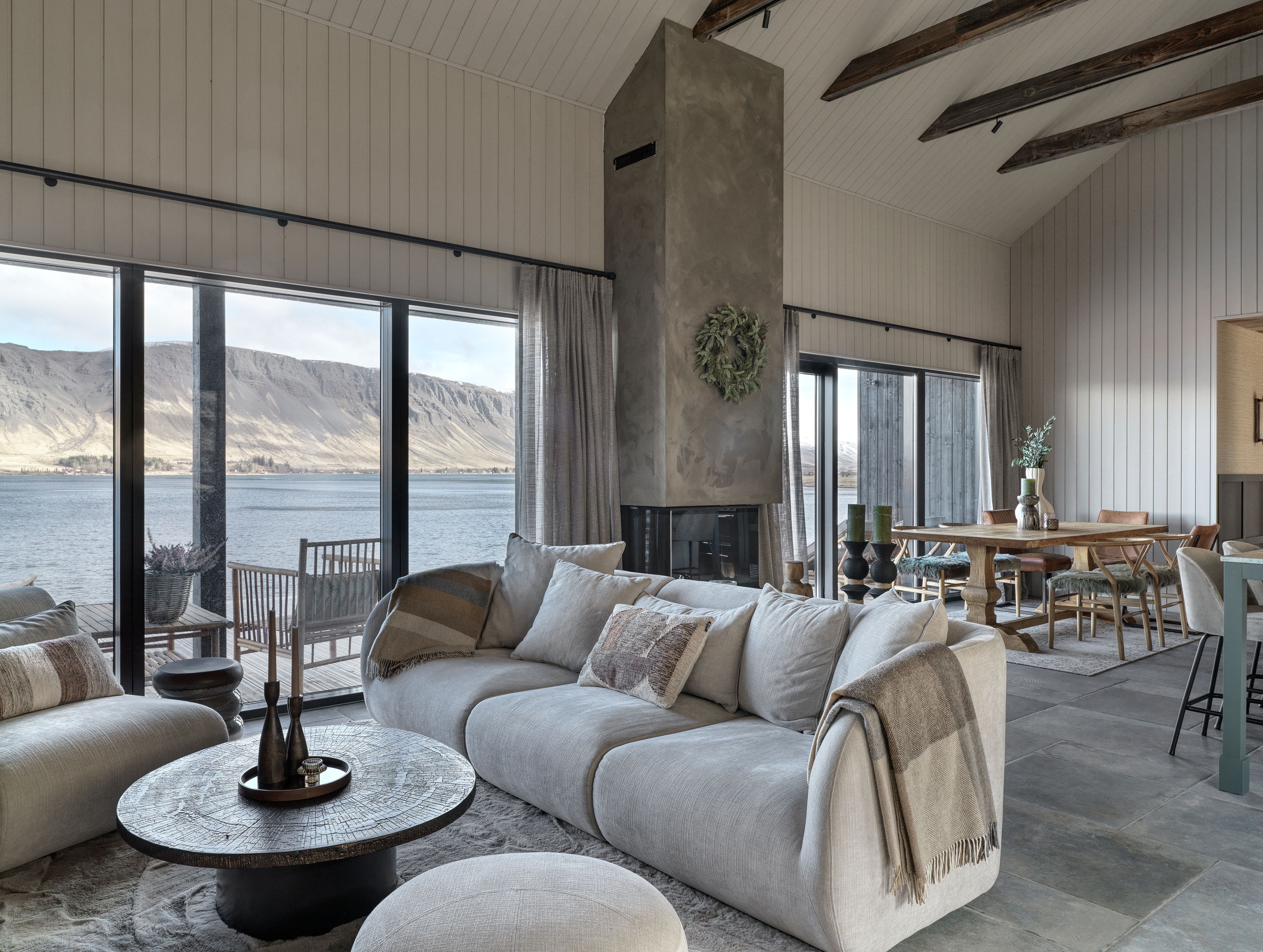 The open-plan living space brings together the kitchen, dining area, and lounge into one continuous environment. Large floor-to-ceiling windows frame the lake and mountains beyond, allowing natural light and the changing landscape to become an integral part of the interior experience.