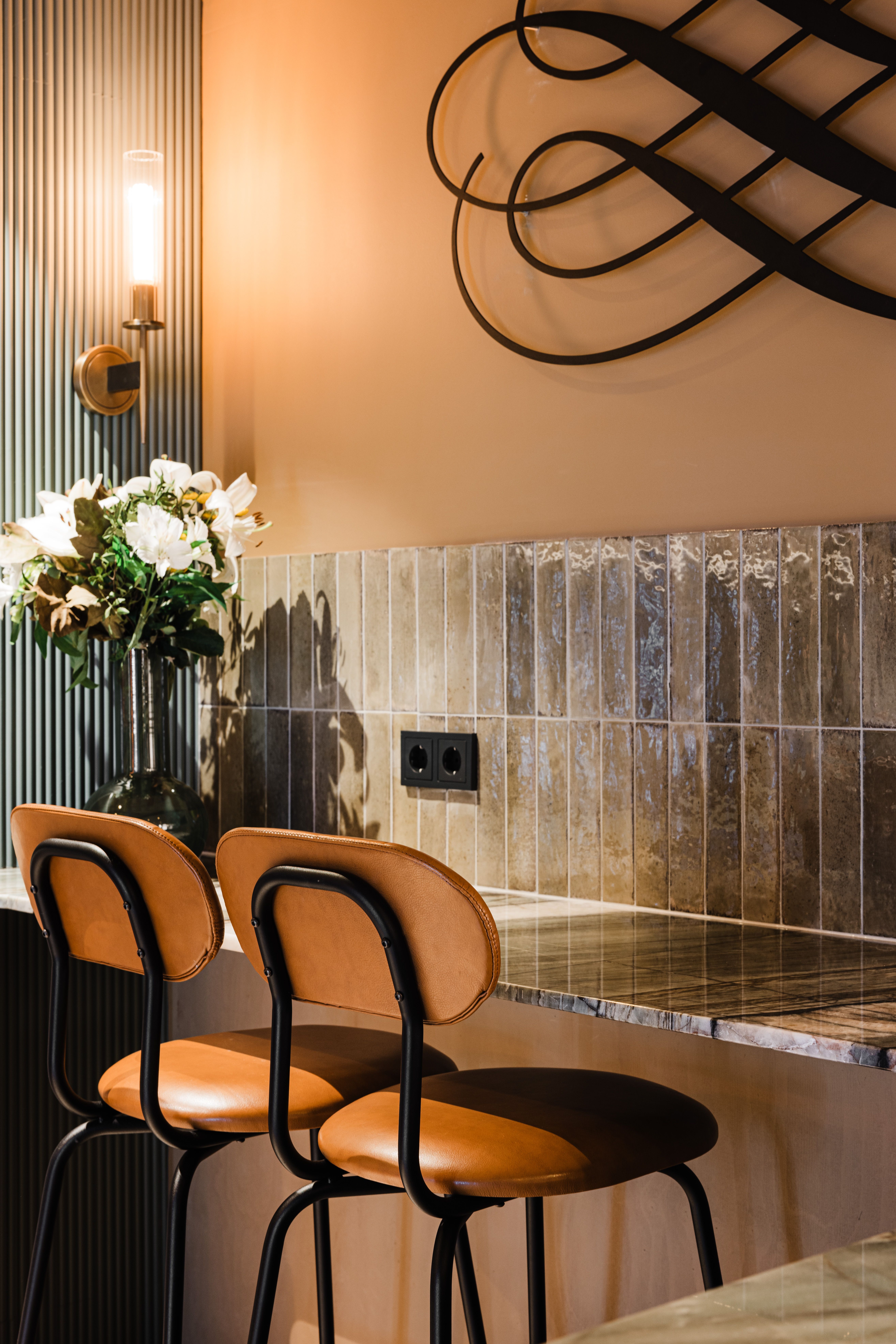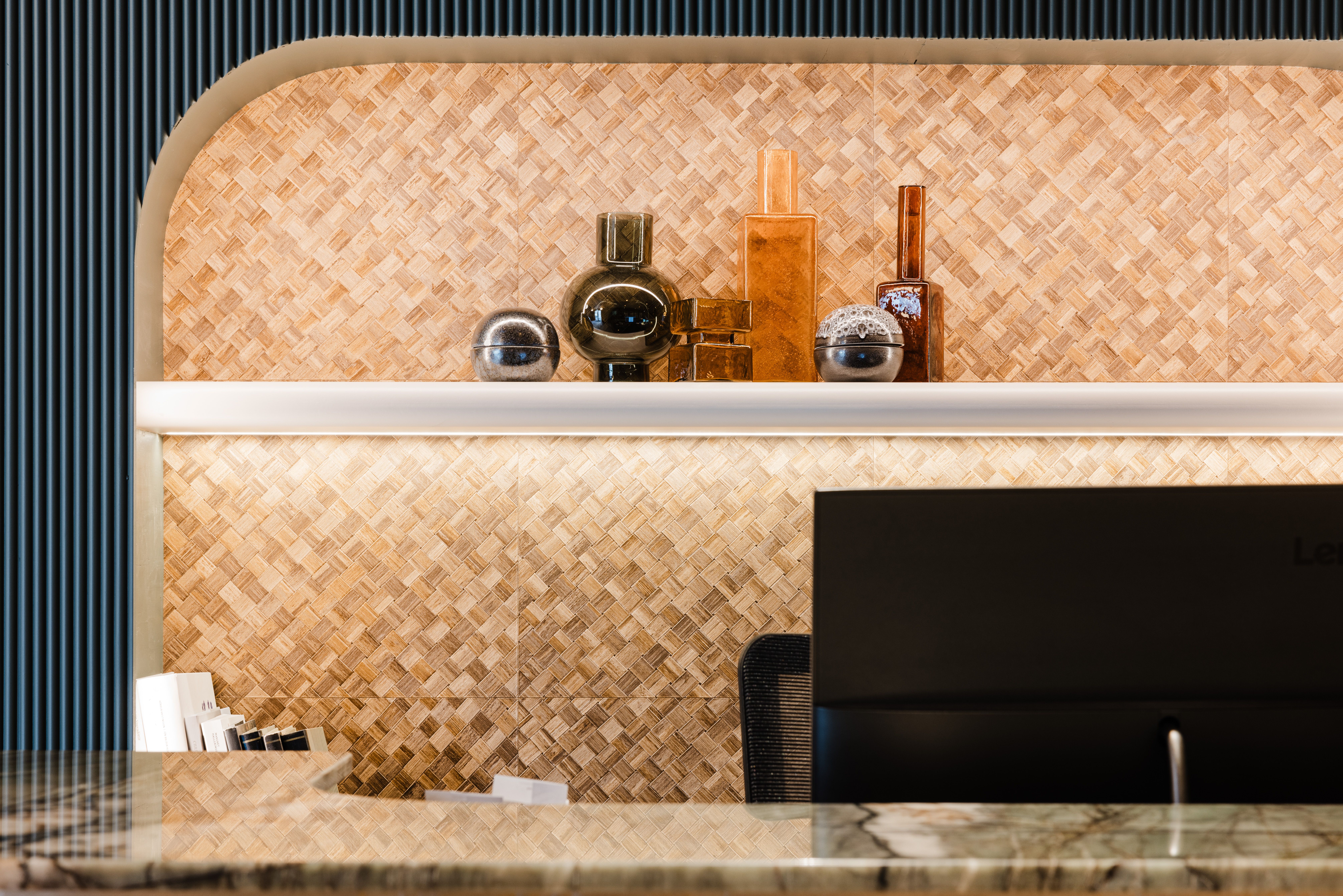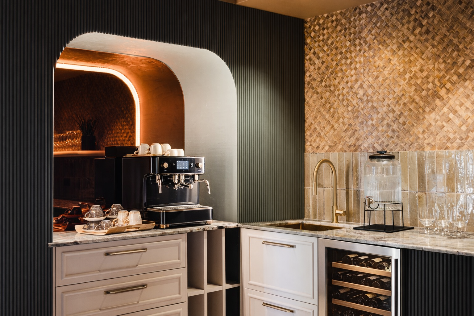 Inside, the interiors are built around warm tones, layered textures, and carefully selected materials. Natural stone surfaces, woven wall finishes, brass lighting, and dark timber elements create a tactile and cohesive palette throughout the spaces. Curved niches, ribbed wall panels, and handcrafted details introduce depth and rhythm while maintaining a sense of simplicity.
