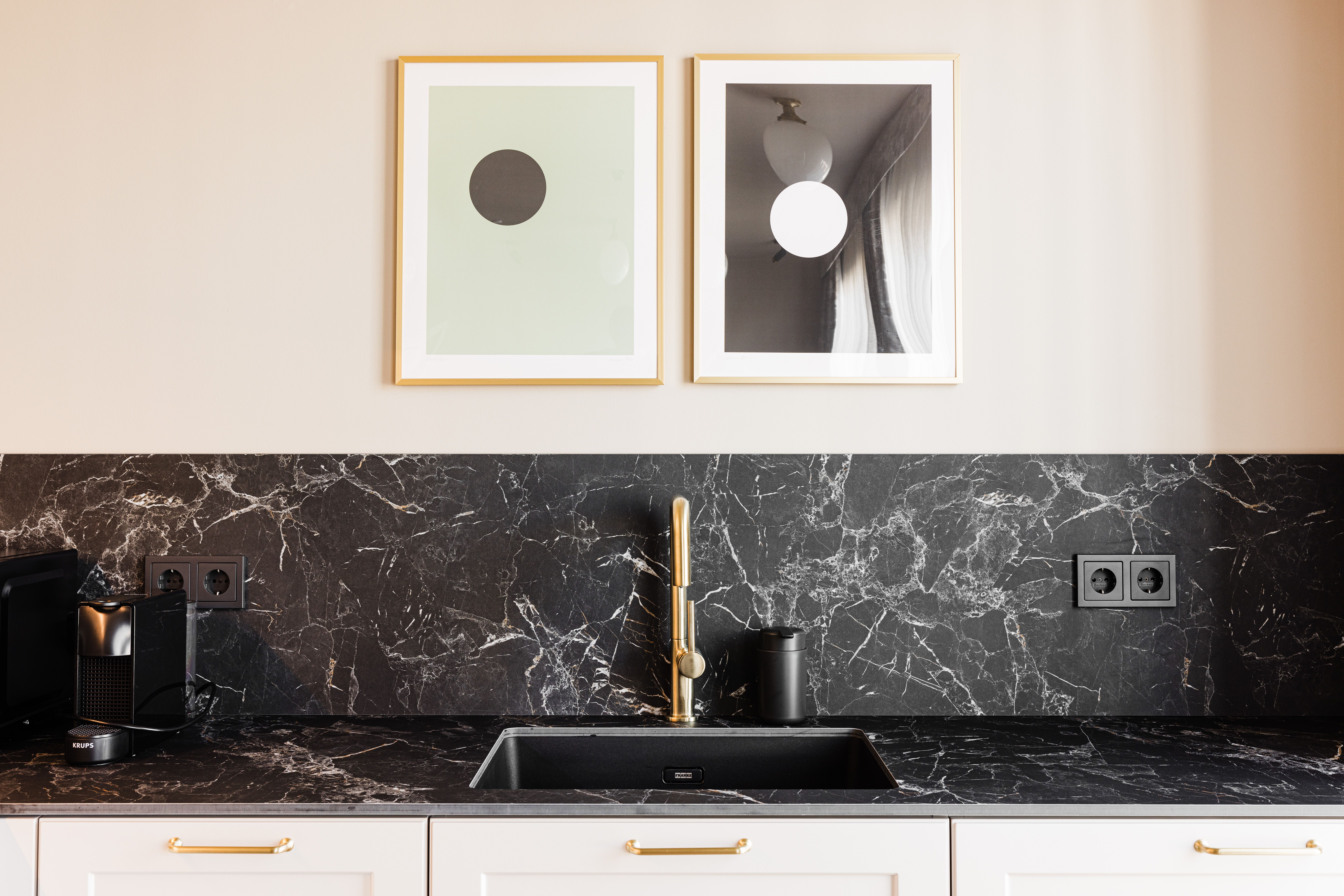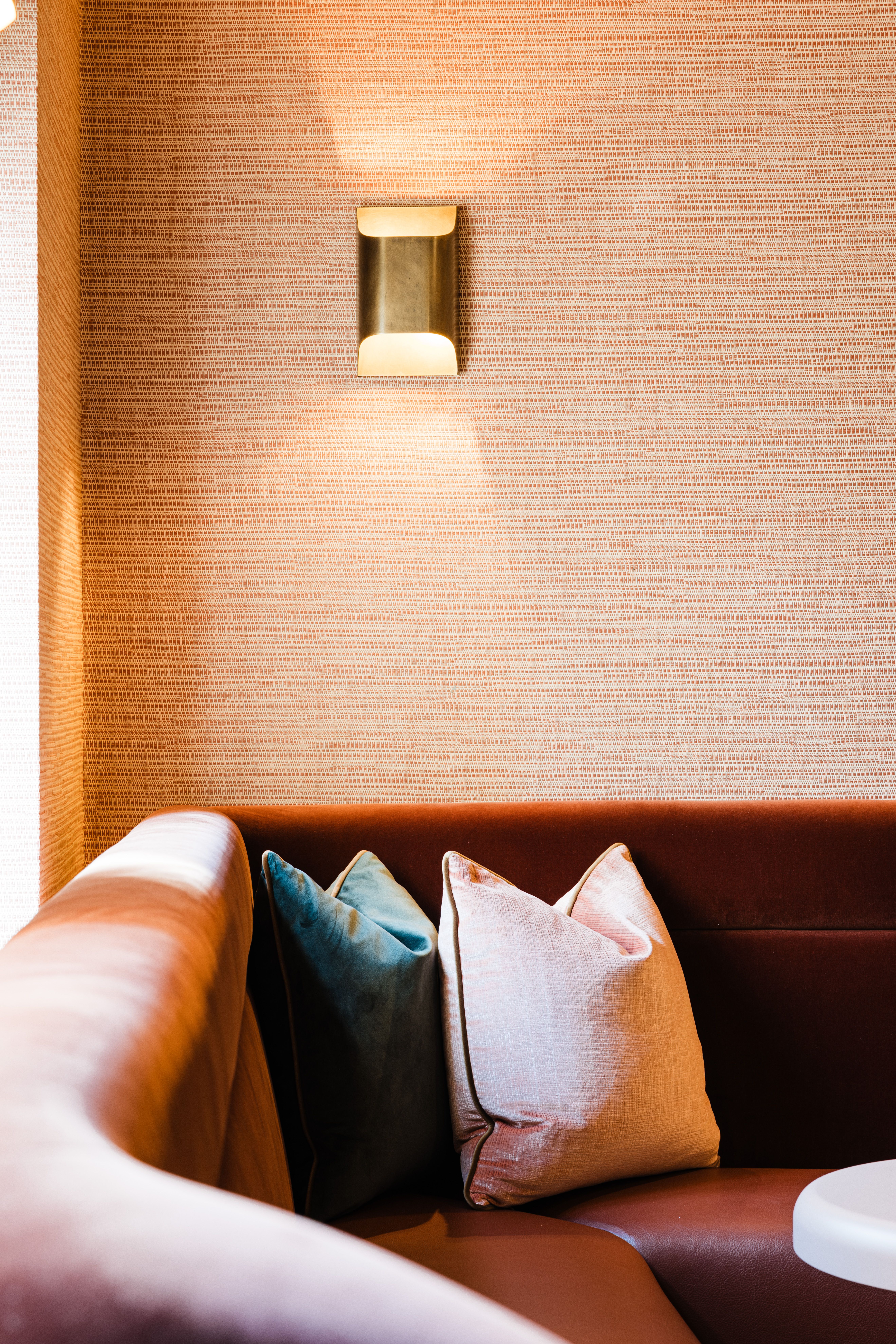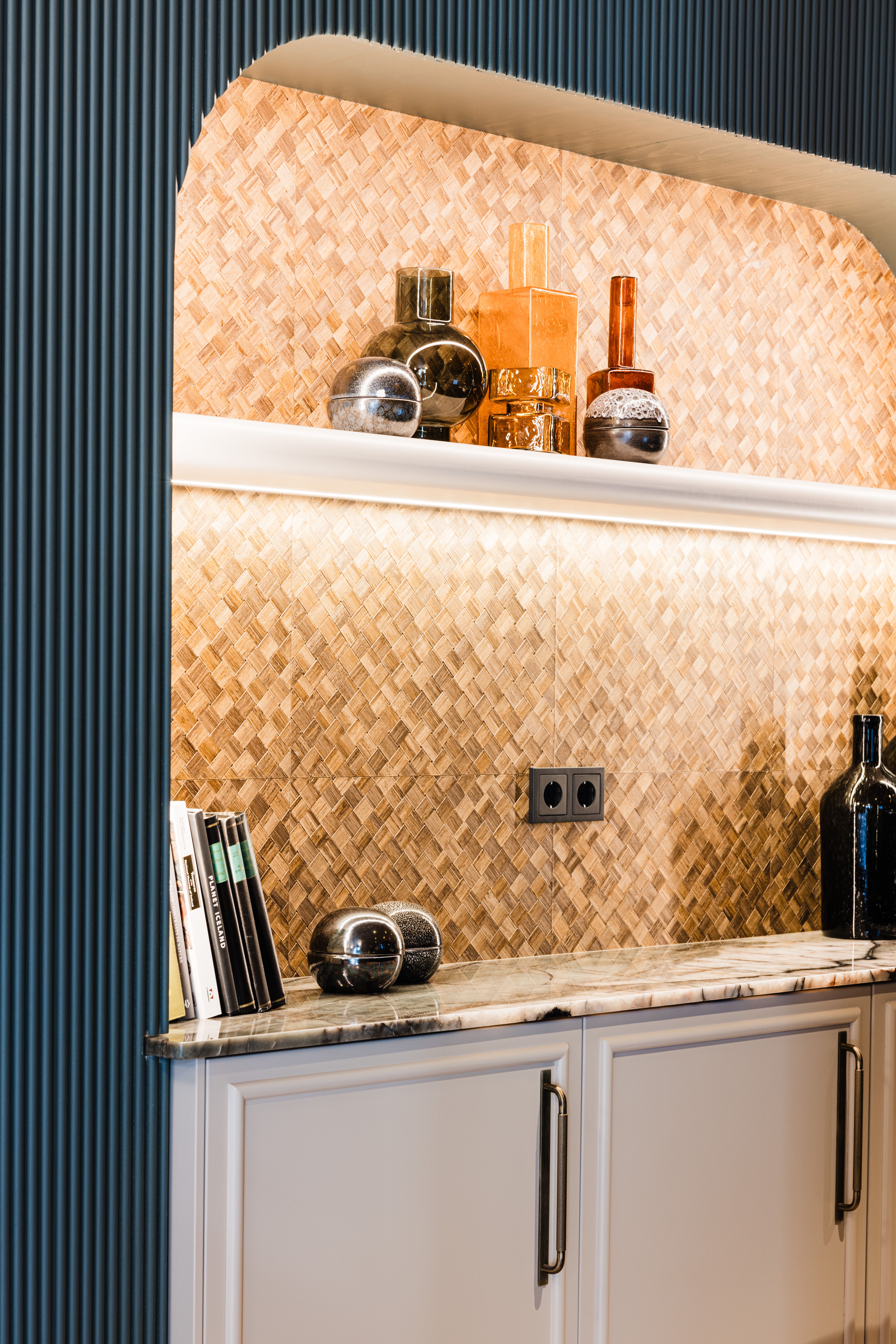 Inside, the interiors are built around warm tones, layered textures, and carefully selected materials. Natural stone surfaces, woven wall finishes, brass lighting, and dark timber elements create a tactile and cohesive palette throughout the spaces. Curved niches, ribbed wall panels, and handcrafted details introduce depth and rhythm while maintaining a sense of simplicity.